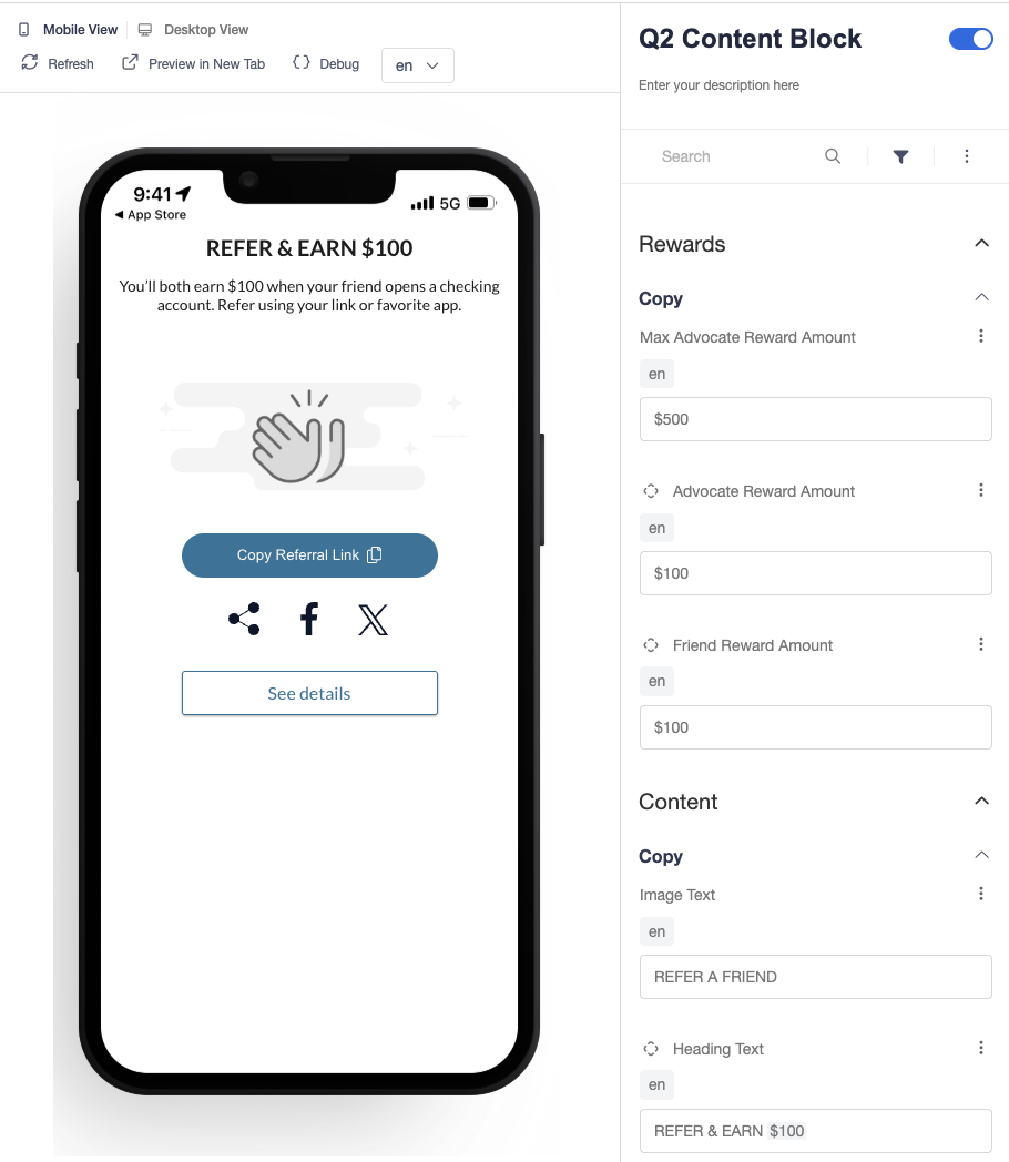- If you are on Q2's Composable Dashboard, you can embed a sharing widget on your main dashboard page using Extole's content block. Users can natively share using their favorite apps directly from the content block without leaving the home screen. If they'd like additional information, they can click on "see details" to be taken to the the referral microsite (hosted by Extole, embedded via SSO.)The content block includes several native sharing options. Clicking on "See details" takes the user to a referral microsite thats embedded into digital banking via SSO (see below.)